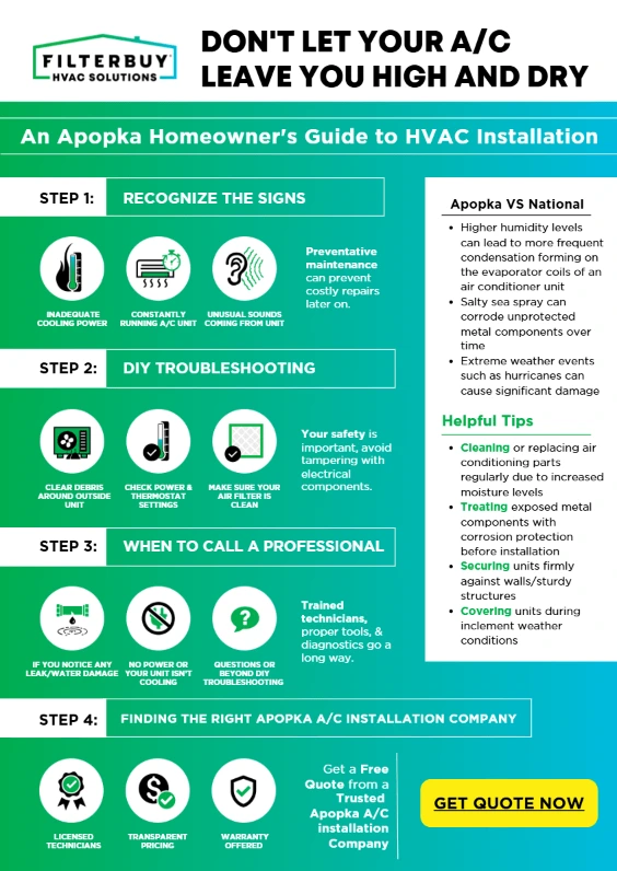 Answer: Based on FilterBuy’s local experience, the best HVAC installation combines licensed, experienced contractors with the right system for your home’s size and layout. Most Apopka homeowners see costs between $5,000–$12,000. Prioritize installation quality, energy efficiency, and local expertise to maximize comfort and long-term savings.